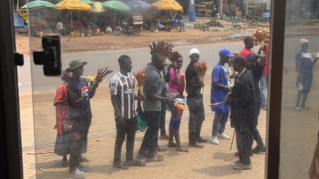 途中トイレ休憩のたびに、パイナップルやジャックフルーツ、肉刺しの販売があります。